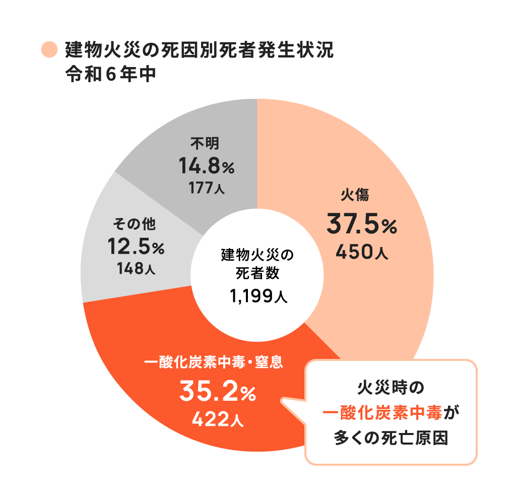 建物火災による死亡原因の多くは、煙や炎に加えCO(一酸化炭素)中毒*によるものです。